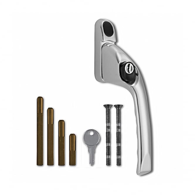 The right hand polished chrome offset Espagnolette handle by Asec is designed with both use and installation in mind and comes complete with 4 sizes of spindle so you don't need to cut anything down on site. Simply pop the required spindle into the back of the handle and it is ready to install, it comes complete with a key, fixing bolts and 4 spindles (15mm, 30mm, 43mm and 55mm).