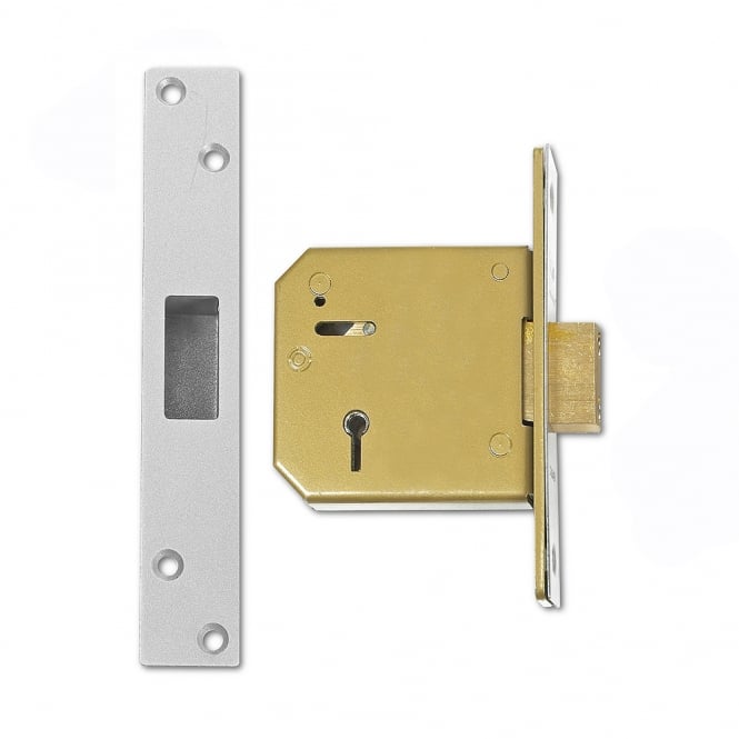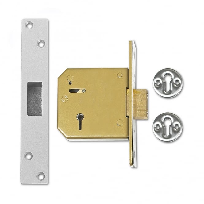 The satin chrome 3G115 5 lever mortice Deadlock by union C-Series has been fire tested and is suitable for use on doors 50mm thick. The 5 lever deadlock comes supplied with 2 keys.
